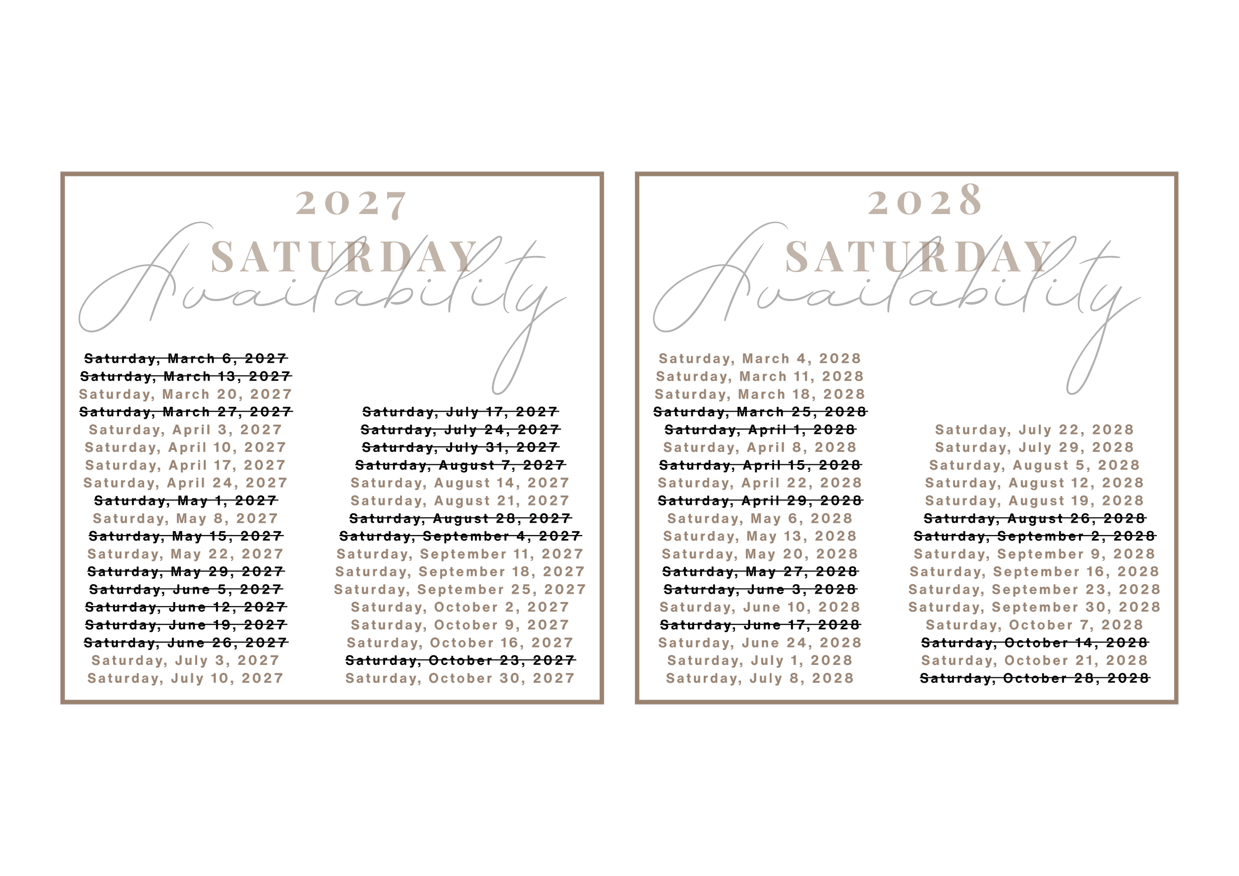 Any dates in black that have a line through them are already booked, remaining available Saturdays are in a neutral tone. Weekdays are available throughout the year.